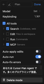 Cursorのカスタムモードの設定方法は https://docs.cursor.com/chat/custom-modes を御覧ください。また、toolsの設定は以下の画像のようにしています。