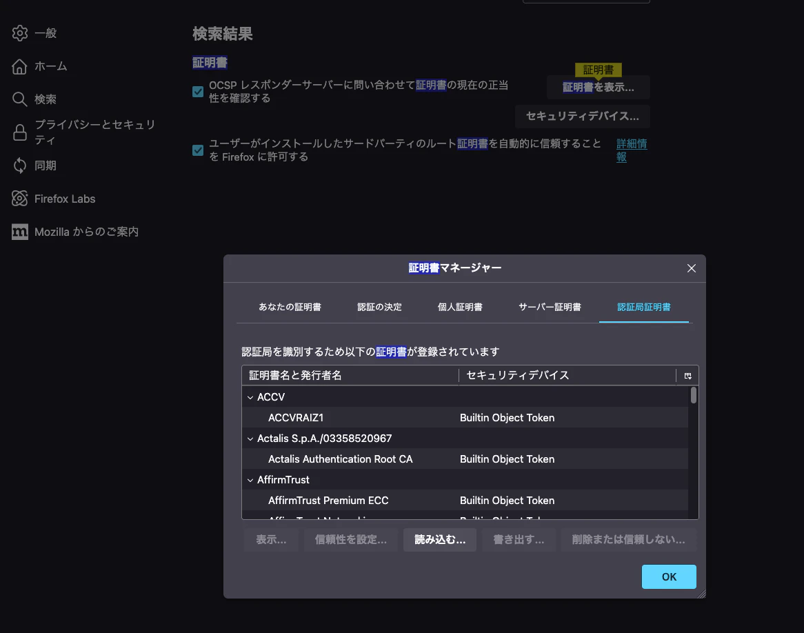 - Firefoxの設定 > プライバシーとセキュリティ > 証明書を表示