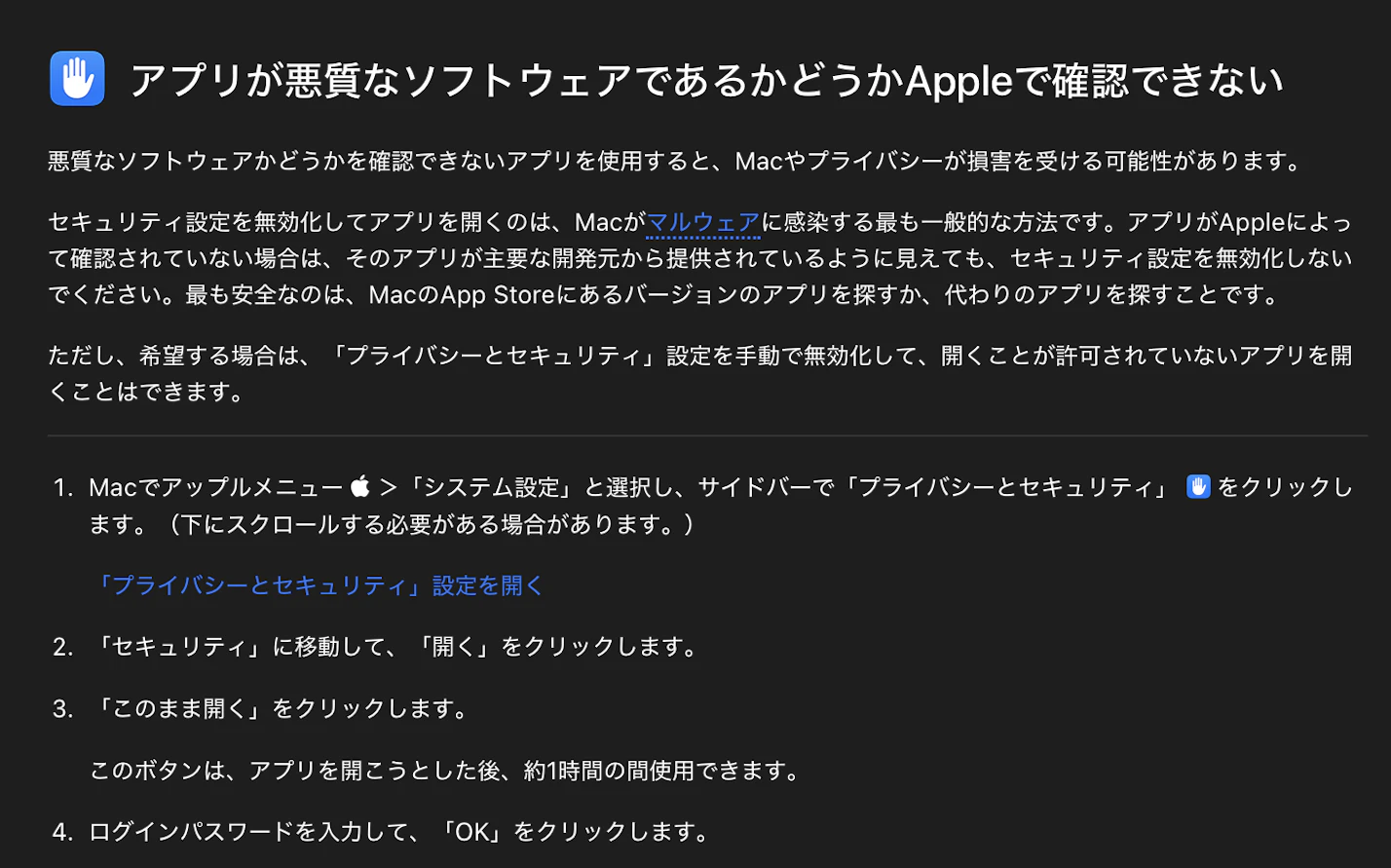 最近のMacのセキュリティ機能により、ZAPがマルウェア判定されてしまい、そのままでは開けません。 (セキュリティリスクを伴う可能性があるため、自己責任で対応してください)