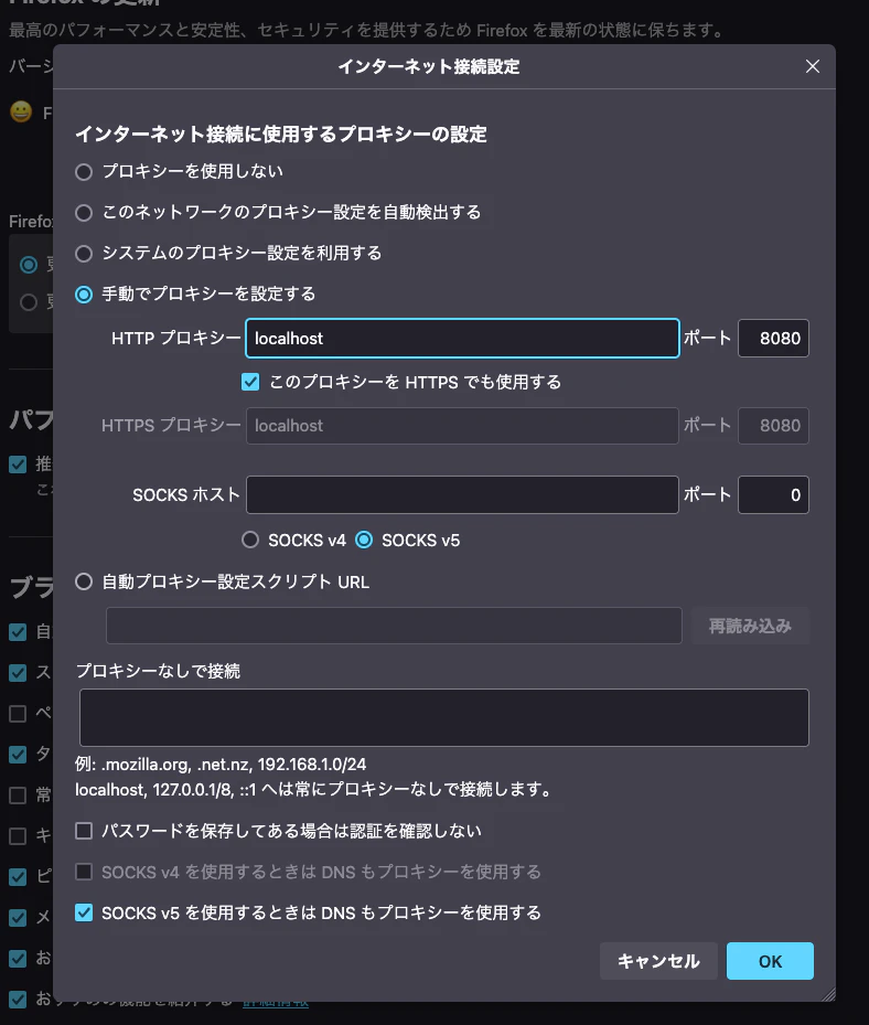 - Firefoxの設定 > ネットワーク設定 > 手動でプロキシー設定する