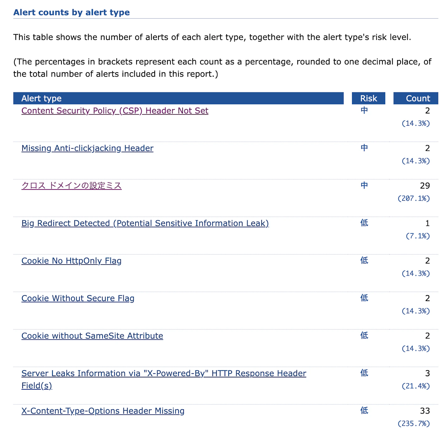 ZAPのレポートでは、以下のようなセキュリティリスクが指摘されます。