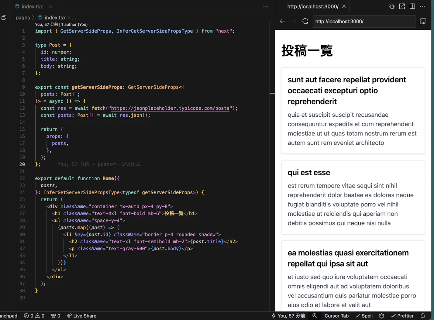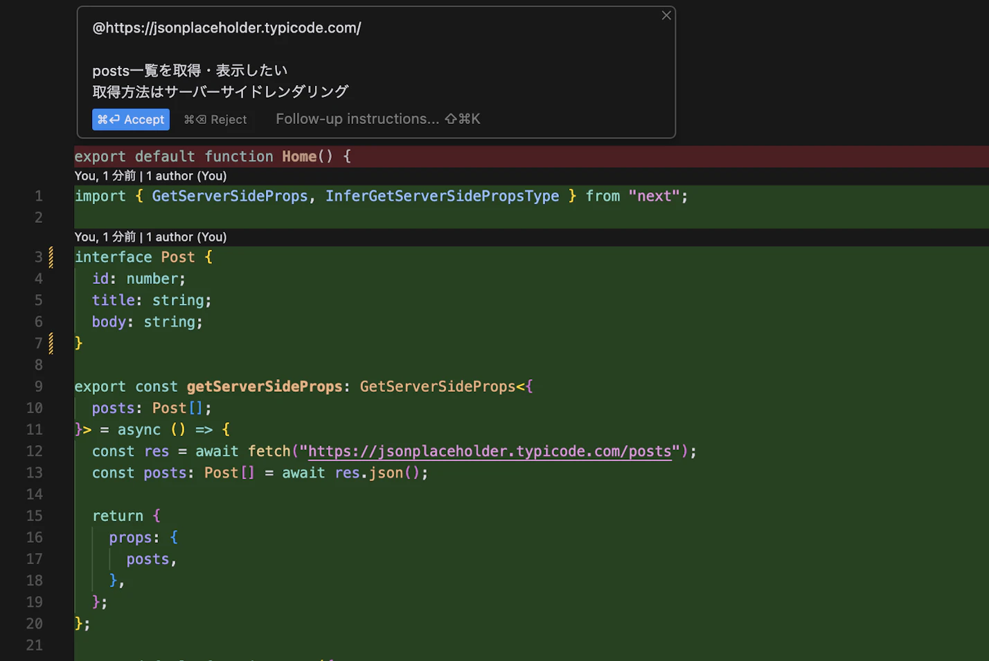 事前データとしてJSONPlaceholderを使用してpostsを表示する基本的なNext.jsアプリケーションを作成しました。すべてCursorの機能の1つであるプロンプトからコードを生成する機能をつかってサクッと実装しています。