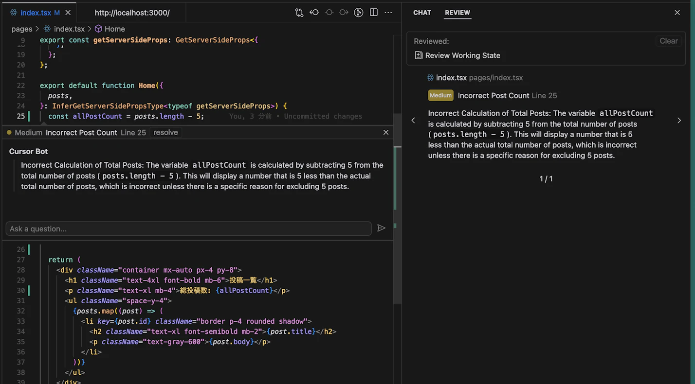 CursorはAI Review以外にも魅力的な機能がたくさんあるのでぜひ触ってみてください。