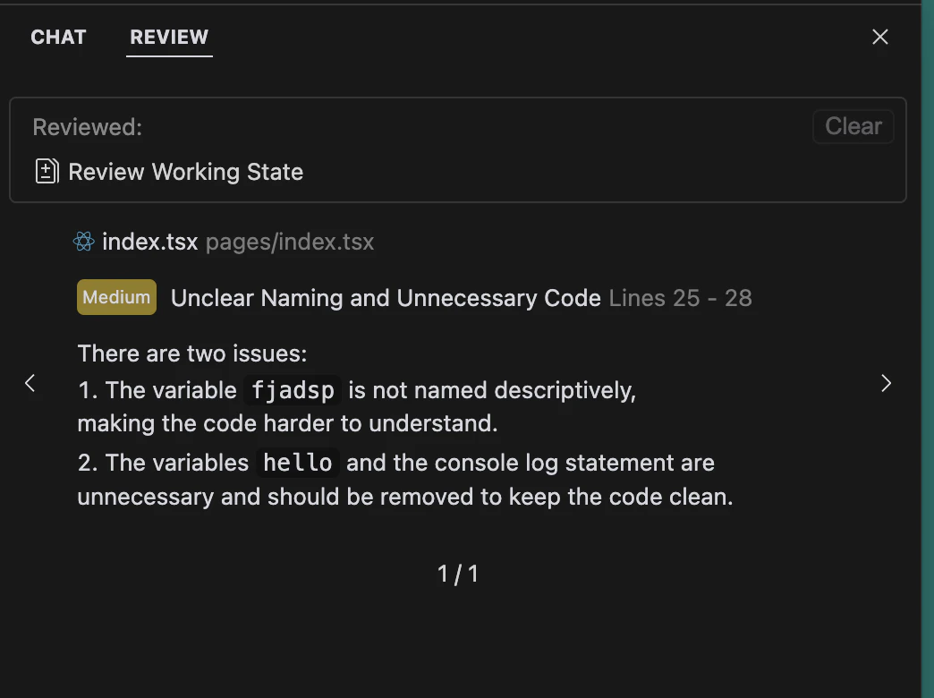 バグの検出以外の面では、指示なしの場合、レビューの精度にはまだ改善の余地がありそうです。使用されていない変数や命名が適当な変数、不要なconsole.log