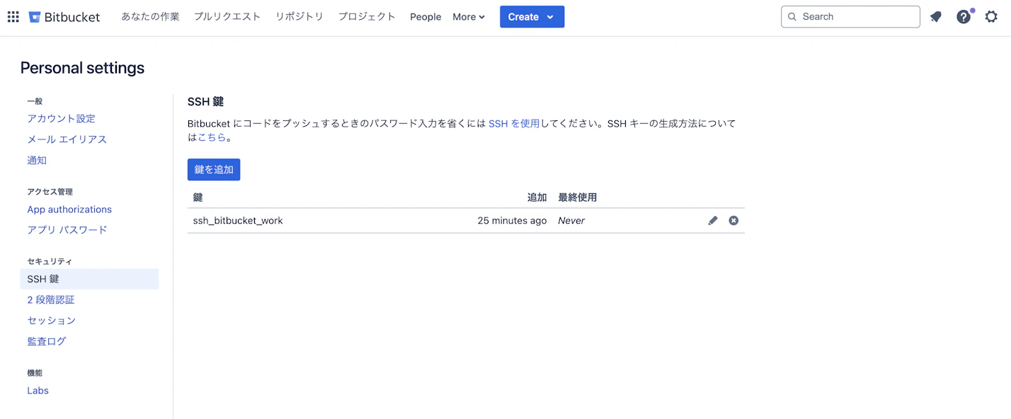 Keyは公開SSHキーファイル (bitbucket_work.pub) をテキスト エディターで開きコピペする- 鍵を追加して完了
