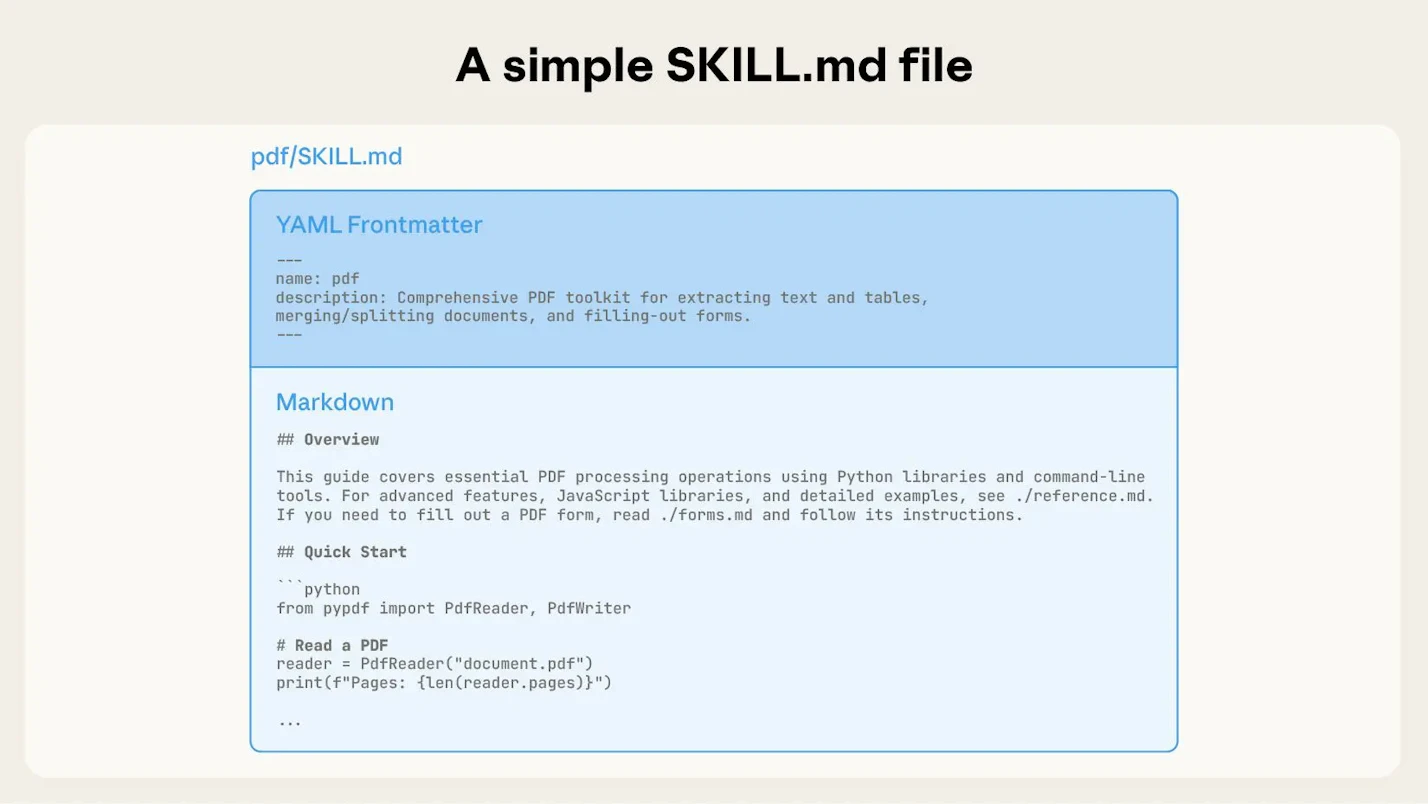 たとえば、「このPDFのフォームに記入して」と言われたら、PDF SkillのSKILL.mdを読み込む、という具合です。