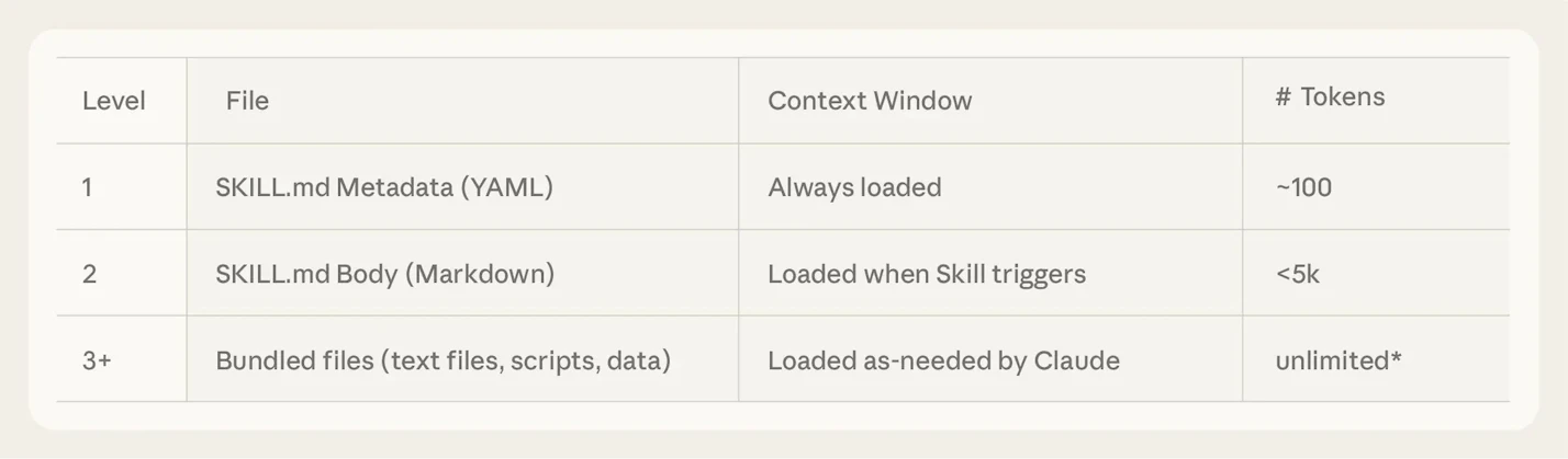 Skillsの最も賢いところは、progressive disclosure(段階的開示)という設計思想です。これは、よく整理されたマニュアルが目次→各章→詳細な付録という構造になっているのと同じで、必要な情報だけを段階的に読み込む仕組みです。