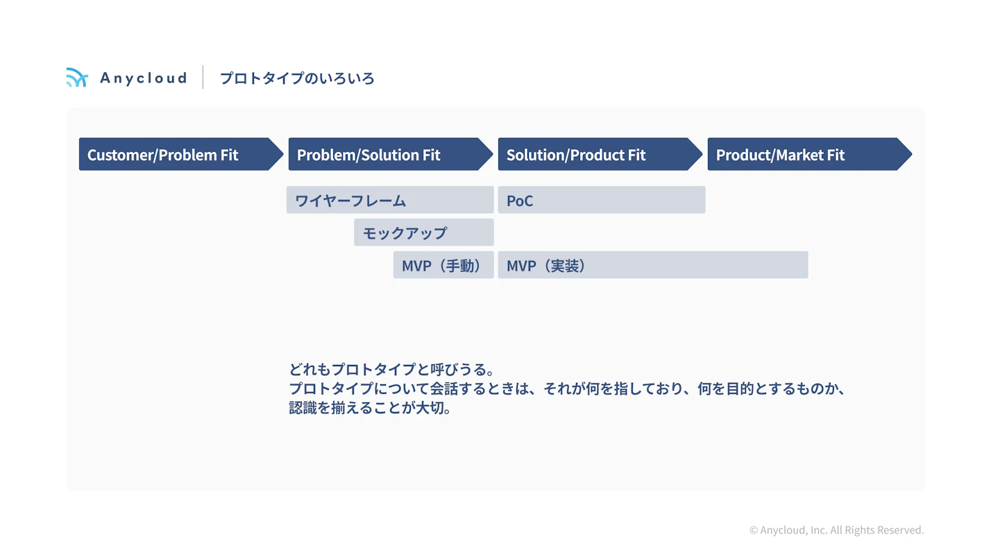 また、プロトタイプと人々が呼ぶものも、文脈によって様々な目的、形態があります。ステークホルダーで認識を揃えて、制作を行います。