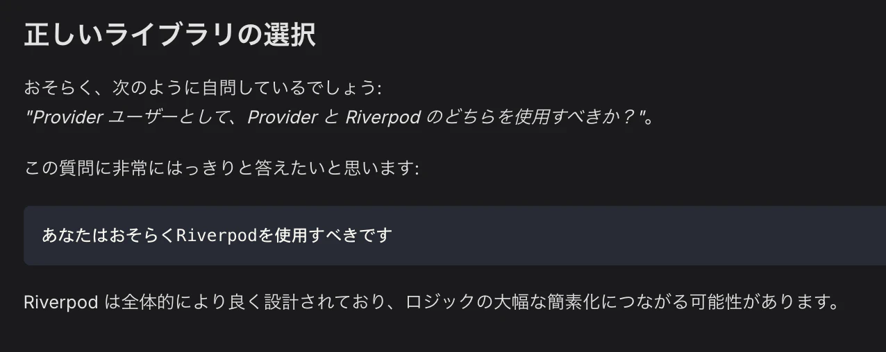 ちなみに、Provider vs Riverpod論争の答えは、ドキュメントにも明確に記載されています。